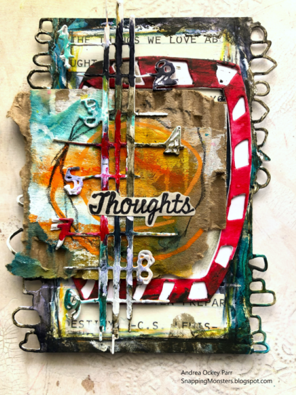 Andrea created texture by adding lots of layers and incorporating cardboard. The number strip is from Seth Apter’s Stretchers Dies and the red and white frame is made from Whimsy Stamps’ Chunky Checkers Dies. The card itself is made using AALL & Create’s Hexalove Dies. The “thoughts” sentiment is from Tim Holtz’s Noble Gent Stamp Set.