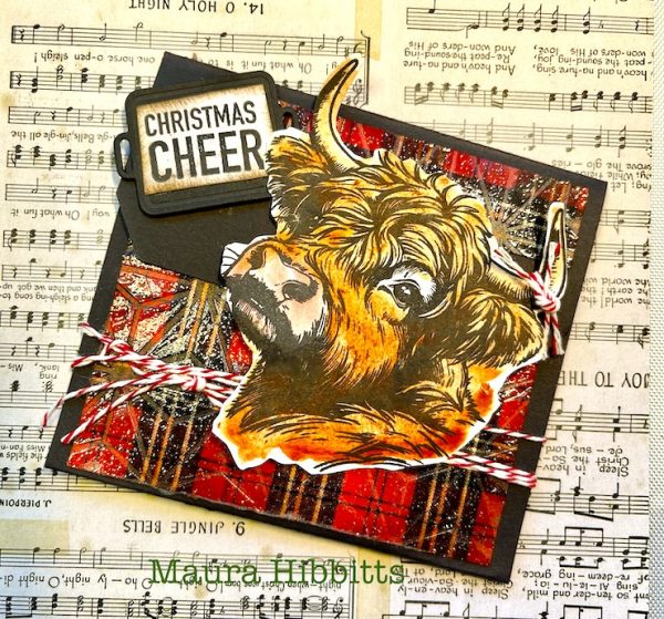 Maura was inspired to make a gift card holder using Simon Says Stamp’s Highland Cows stamps, Simon Says Stamp Plaque Slides Christmas stamps and dies, Tim Holtz Sparkle Texture Paste, and Tim Holtz Idea-ology Christmas Background paper.