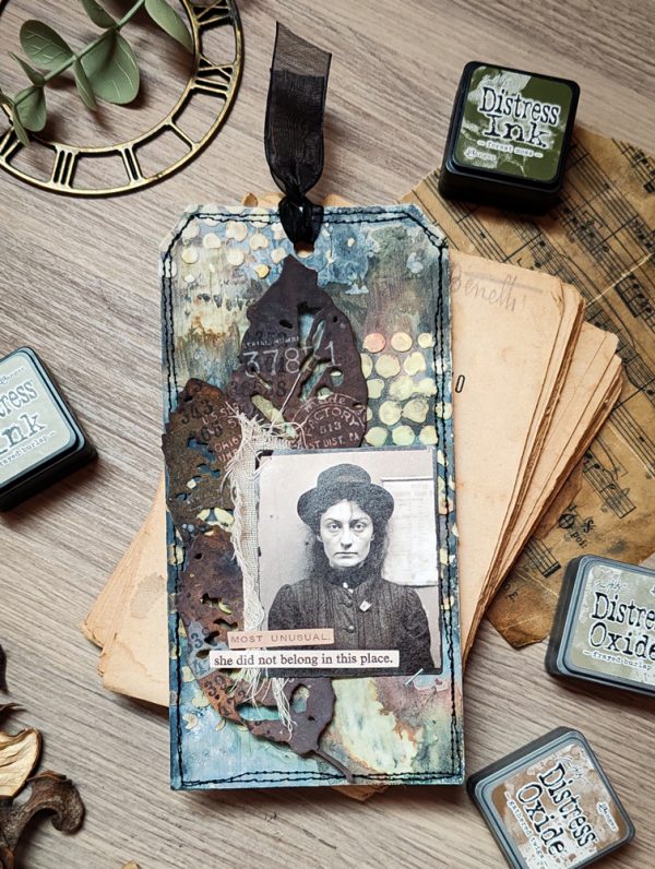 Zoey used one of her favorite stencil and texture paste to add some grunge to this tag. She then used a combination of Distress Ink and Oxide for the background and decorated it with Die Cut Leaves and Ideaology Sticker Book