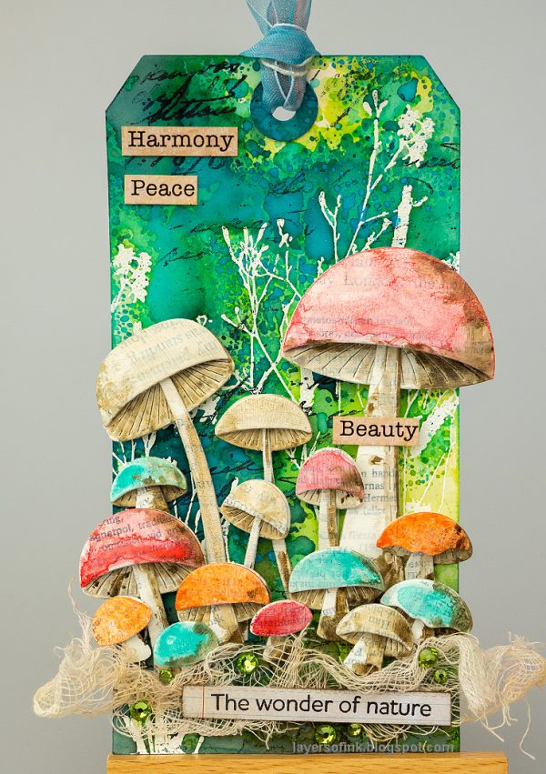 Anna-Karin made a tag with colorful, textured mushrooms and a textured inky background. She used Simon Says Stamp Tall Mushrooms, Pocket Full of Mushrooms and Mushroom Stems to die cut the mushrooms. Grass from Tim Holtz Nature’s Discovery is stamped in the background.