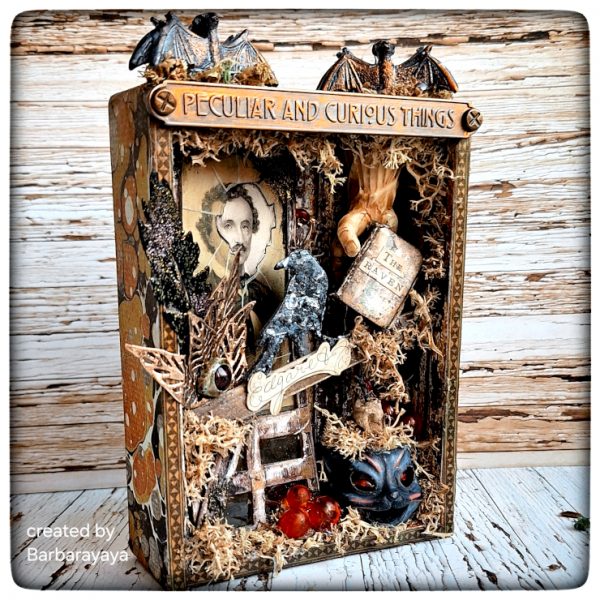 Barbara created a Halloween Idea-ology Vignette box. I added Simon Says Stamp Sparkle Paste Black, Tim Holtz Distress Mica Flakes Ranger, and Tim Holtz Distress Texture Paste Black Opaque Ranger to keep with the theme. She cut the crow by using Tim Holtz Sizzix Vault Gothic Portraits Thinlits Dies. She added some Idea-ology elements, including Tim Holtz Idea-ology Trick or Treat and Tim Holtz Idea-ology 2024 Halloween Baseboards.