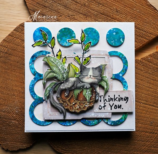 Macarena‘s love for cats led her to use the amazing Stamperia Furry Friends collection and its Assorted Die Cuts. She placed the lovely cat on the Simon Says Stamp Circle Quilt die and also used the circle leftovers to fill the page. She finished the card with a sentiment from Tim Holtz Abstract Florals stamp set.