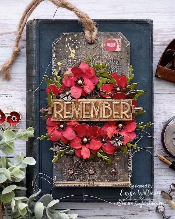 Emma has created a tribute of remembrance to honour those who have fought so bravely for our countries. She created a wreath of poppies using the Sizzix Brushstroke Flowers 2 die by Tim Holtz which she layered onto a Stampers Anonymous Etcetera tag. The background features the Rosette Mini Layering Stencil.