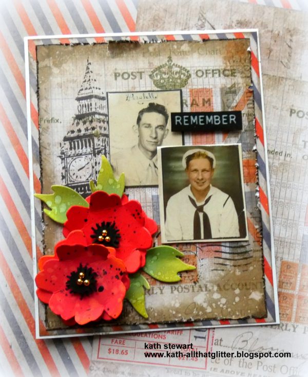 Kath was also inspired to create a card to honour the heroism of all those who have gone to war, past and present, to defend our liberty and to remember those who never returned, those who suffered life changing injuries and those that are left with memories that severely impact their lives. She used Tim Holtz/Idea-ology Correspondence Vault 2025 Paper Stash, Stampers Anonymous London Sights, Sizzix Modern Floristry Thinlits and Idea-ology Photobooth and Thoughts Label Stickers.