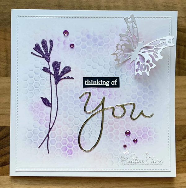 Pauline created a simple background by blending Tim Holtz Distress Oxide inks through a Lavinia Honeycomb stencil, then added die cuts using Simon Says Stamp Fresh Daisies die, a butterfly from AALL & Create Papyrus Essence die set, and the Simon Says You wafer die and matching You Matter stamp set.