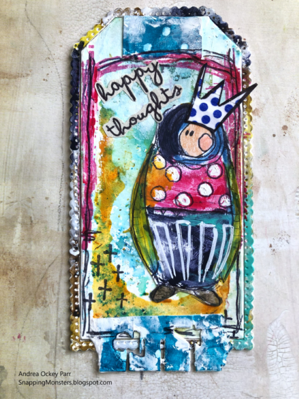 Andrea made a thinking of you/happy thoughts tag using a quirky character from Kate Crane’s KC015 stamp set. The sentiment is from Tim Holtz’s THMM182 stamp/stencil set. The tag itself is cut from Poppy Stamps’ Scalloped Pinpoint Tags die set.