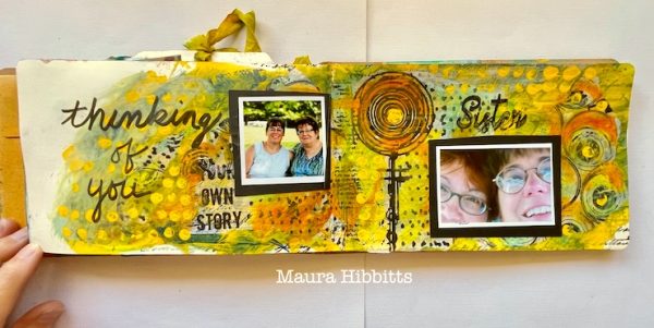 Maura created an art journal spread about her sister. She used Simon Says Stamp’s Sisters Forever stamp set, Seth Apter Paper Artsy Printed Tissue, Tim Holtz Collage Medium, and Dina Wakley Scribble Sticks.