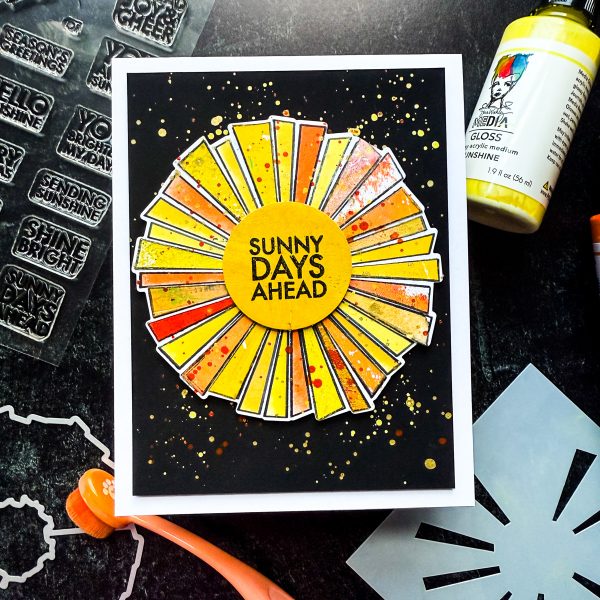 Cheiron created a sunny card to let a friend know she was thinking of them. She used the Simon Says Stamp Retro Wreath Die + Stencil set along with collage papers and Distress Oxides to create her wreath. She added it to a background of Distress Black Heavystock and finished it with spatter using Foundry Wax and Dina Wakley Gloss Droppers.