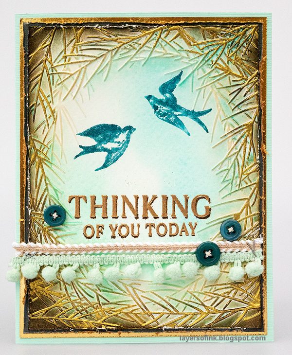 Anna-Karin made a thinking of you card using the Wispy Pine Needle Frame embossing folder from the new And Everything Nice release. The birds come from Simon Says Stamp Vintage Blooms and Beautiful and Curious sets.
