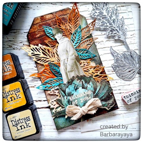 Barbara created a fall tag using the Simon Says Stamp Luggage Tags Wafer Dies (I confess, I’m in love with this die!). She added lots of fall leaves cut with the Tim Holtz Sizzix Skeleton Leaves Thinlits Die and colored them with Ranger Ink Distress Spray Stain. For the background, she used the Bricked stencil by Tim Holtz Stampers Anonymous.