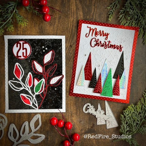 Carrie created two holiday cards using a Simon Says Stamp Cheery Snowflakes Embossing Folder and a Leafy Branch Die along with some Tim Holtz and Sizzix Dies to create layers of coordinating fun. The Black Mirror and Ruby Red Cardstock adds the perfect shine this holiday season!