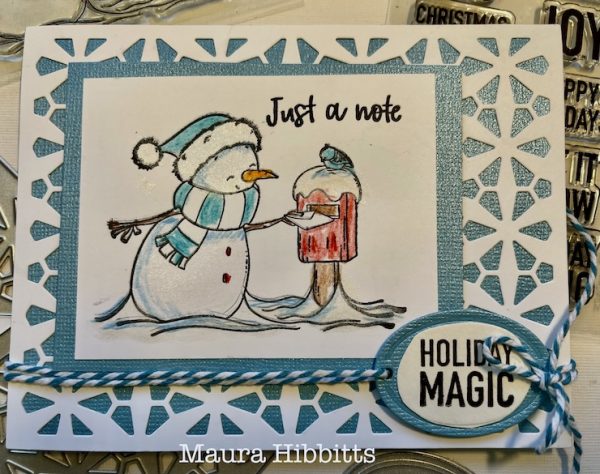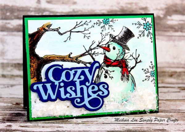 Meihsia was inspired to create a Christmas card using Tim Holtz Cling Rubber Stamps Mr. Frostie on the background, and decorated it with Simon Says Stamp Cozy Wishes Wafer Dies and Tim Holtz Distress Mica Flakes Ranger.