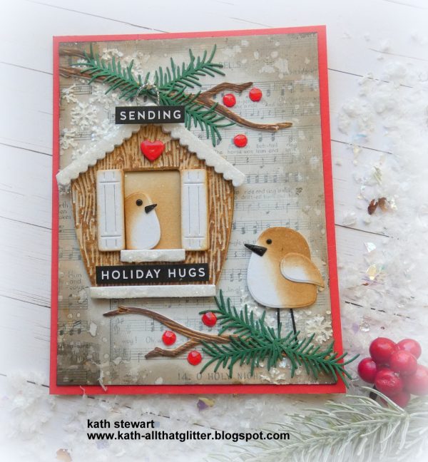 Kath created a Christmas snowy scene card using Simon Says Stamp Cozy Birdhouse and Birdies dies, Tim Holtz/Stampers Anonymous Flurries Mini Layering Stencil from Set 50 with Distress Grit Paste and Distress Rock Candy Chunky Glitter and Reverse Merriest Christmas Sentiment Strips.