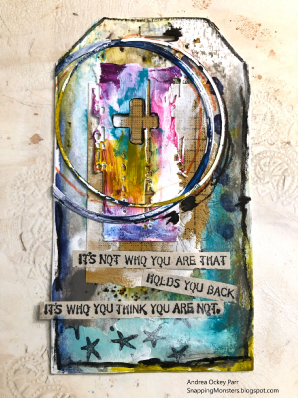 Andrea made a tag using Simon Says Stamp Luggage Tags and Thin Frames Die Sets. She also used Seth Apter’s Cutz 1 die set and Tim Holtz’s Just Thoughts stamp set for the sentiment.