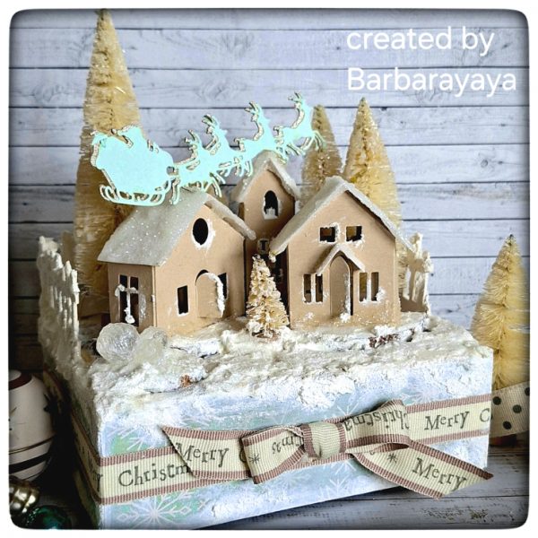 Barbara created a mini Christmas village using two dies: Tim Holtz Sizzix Paper Village Thinlits Dies 664741, and the Tim Holtz Sizzix exclusive die for Simon Says Stamp for December 2021. She used an Idea-ology Vignette Box as a base, which she then covered with Ranger Ink Distress Grit Paste and Distress Rock Candy Clear. For the snowy forest, she chose Idea-ology Tim Holtz idea-ology Christmas Woodland Trees Alpine.