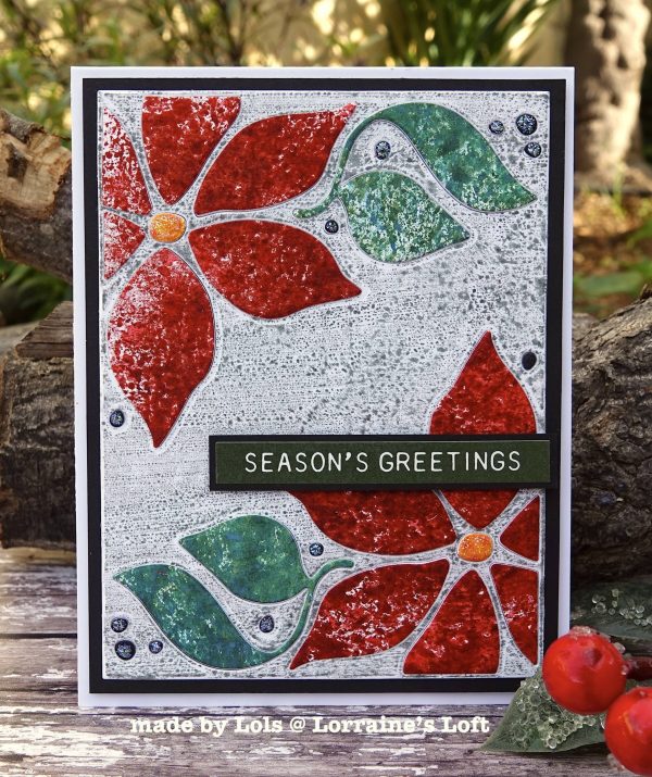 Lols made a Christmas card using a Simon Says Stamp Poinsettia Cover Die. For the background she swiped Tim Holtz Iced Spruce Distress Ink over a Craft Sheet and placed a piece of Distress Watercolor Paper in the ink. She used a similar technique for the reds and greens. She finished with a Tim Holtz Christmas Sentiment Sticker.