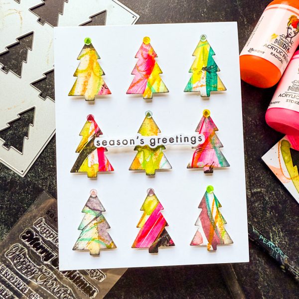 Cheiron created a bright Christmas Greeting using the Simon Says Stamp CZ Design Tree Plate Greetings stamps and coordinating dies. She cut up a piece of collage paper that she painted with Dina Wakley Media Paints and spattered with Gilded Foundry Wax for an extra festive touch.