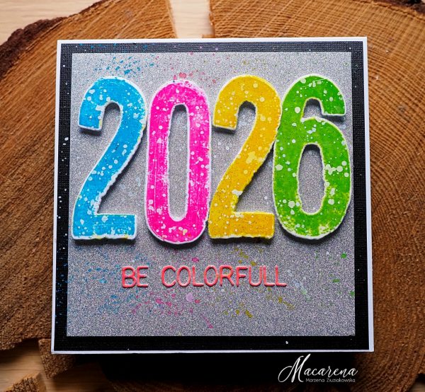 Macarena wishes all of you and herself a very colorfull and happy 2026. She made a really sparkle and shining card using as a background the Tim Holtz Idea-ology Kraft Stock Sparkle Classic in silver and she stamped and die cut the numbers with Tim Holtz Paint By Number stamp and coordinated dies which she additionally covered with Tim Holtz Distres Texture Sparkle Paste.