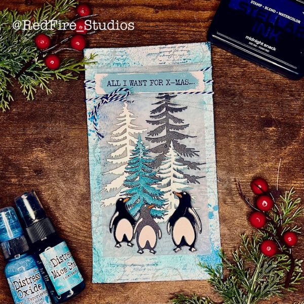 Carrie created some sparkle and shine using various products and dies from Elizabeth Craft Designs. The background consisted of Ranger Salty Ocean Distress Oxides, Shiny Bauble Mica Stain, Simon Hurley Midnight Snack Stellar Ink, and an ECD Stencil and stamps. A piece of vellum served as the base for the EDC trees and penguins, many coated in Astro Paste. The photo doesn’t do all of the shiny metallic papers justice in this whimsical holiday make!