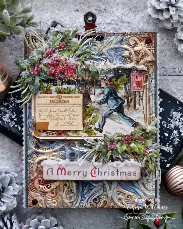 Emma used various Tim Holtz Idea-ology and Sizzix products including the Engraved Embossing Folder, Christmas Layers and Paper Dolls, Christmas Baseboards and Ephemera to create her final Christmas project of 2025. To add the sparkle and shine to her Stampers Anonymous Etcetera Panel, she added some of the special edition sparkly bundle from Tim, and Metallic Flakes.