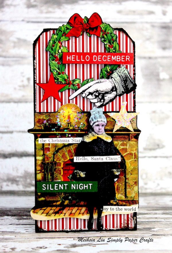 Meihsia was inspired to create a holiday tag using Tim Holtz idea-ology 2025 Christmas Backdrops on the background, and decorated it with Tim Holtz idea-ology 2025 Christmas Sticker and Ranger Stickles Moon Dust Glitter Gel.