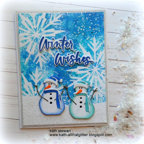 Kath made a winter card with the snowflake and snowman dies from Tim Holtz/Sizzix Vault Winter Wishes Thinlits and used Broken China Distress Spritz and Distress Rock Candy Chunky Glitter to create sparkle and shine.