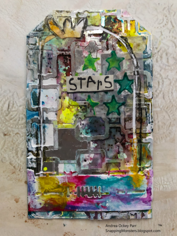 Andrea added shine to her card with some Chrome Silver Cardstock. She cut shapes out of it with Seth Apter’s Waffles die and added some pops of color with Fluorescent Neon Alcohol Ink. The stars sentiment is from Tim Holtz’s Seasonal Scribbles stamp set.