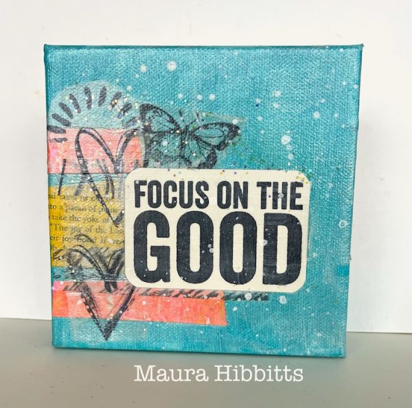 Maura made a small art canvas inspired by teamie, Cheiron. She used Tim Holtz’s Bold Sayings stamp, Simople Stories Vintage Woodland stamps and Simon Says Stamp Old Letter stamp. She added sparkle with Simon Says Stamp Chunky Glitter and shimmer with Dylusions White Linen Shimmer paint.