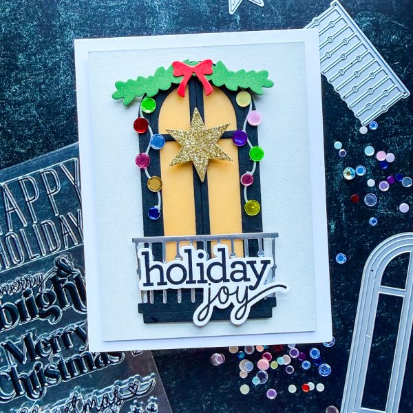 Cheiron created a holiday door scene with lots of sparkle and shine. She used the Balcony Windows combined with the Holiday Window Decor to create her door and embellished it with a glittery star and lots of sequins. For the sentiment, she used a stamp from the CZ Design Making Spirits Bright stamps + dies.