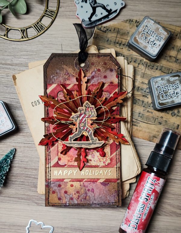 Zoey used Tim Holtz Holiday Sketchbook Stamp with coordinating Simon Says Stamp dies to decorate her focal point. She also used Distress Oxide ink and Distress SPRITZ to add some shine and sparkle!