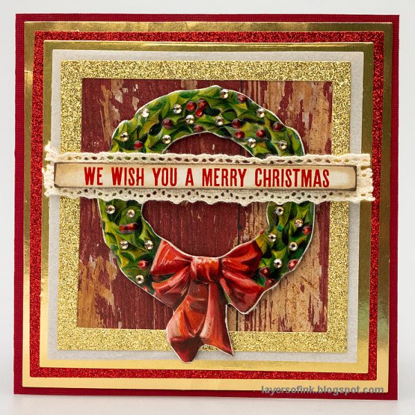 Anna-Karin made a sparkly and shiny Christmas card using Simon Says Stamp new Basic Shapes Squares and Matte Gold and Gold Glitter cardstock. The wreath and sentiment come from Tim Holtz idea-ology Christmas Baseboards.