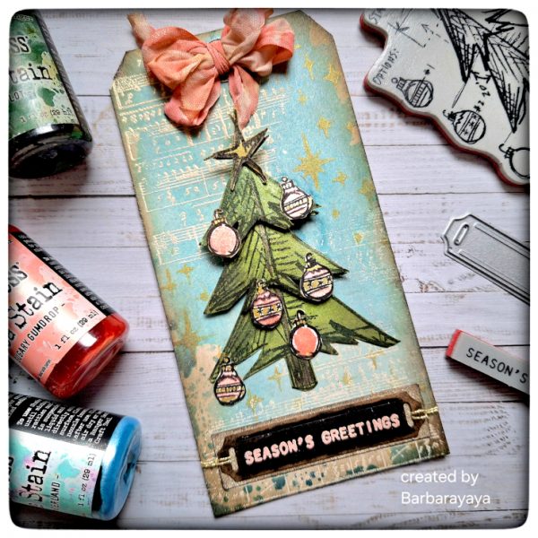 Barbara made a tag using the sparkly Ranger Distress Mica Stains for both the background and coloring. She chose three sets from Tim Holtz Stampers Anonymous: Christmas Blueprint CMS135, Music and Advert CMS358, and Tiny Text Christmas CMS424. To complete the tag, the sentiment was stamped and glued onto a label cut with the super-versatile Label Slides Wafer Dies from Simon Says Stamp and a little sparkle was added with Idea-ology Kraft Stock Sparkle Classic.