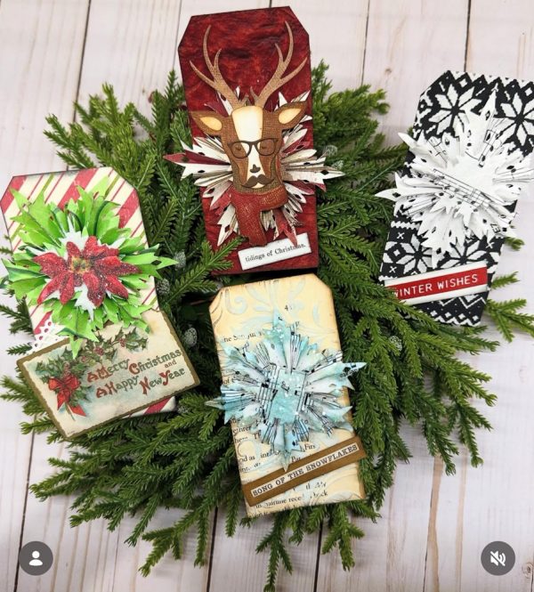 #8 Debbie Emmons – Cheiron says: I love all of these die cut tags from Debbie! The beautiful holly, the whimsical deer with his specs and that tag with the black and white? Amazing contrast!