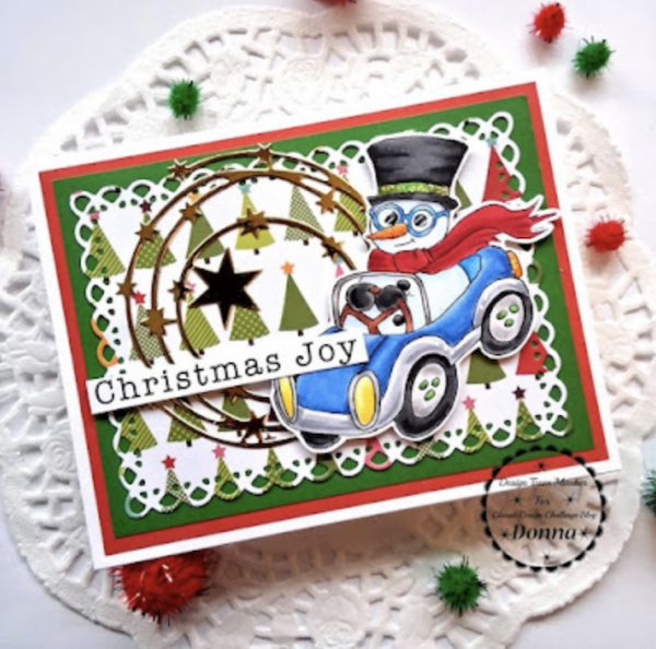#12 Donna W. Meihsia says, This is such a fun and awesome holiday card. Love the beautiful layered embellishments on the background. The snowman image and the Christmas sentiment are fantastic!