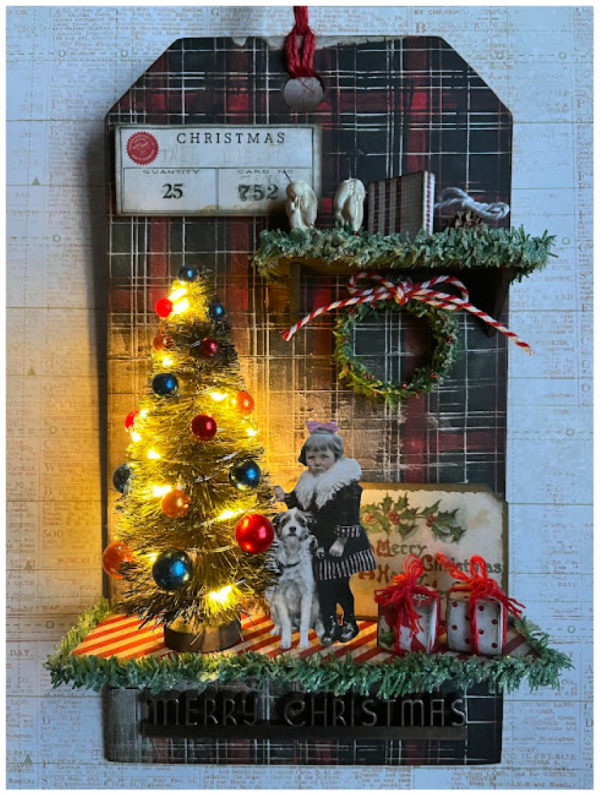 #129. SusanneAndrea says, This tag is absolutely incredible! It reminds me of a diorama where we are getting a sneak-peak into a quaint holiday scene. I love the nostalgic feelings it elicits and I was blown away when I saw that the tree lights up! This is a festive treasure indeed.