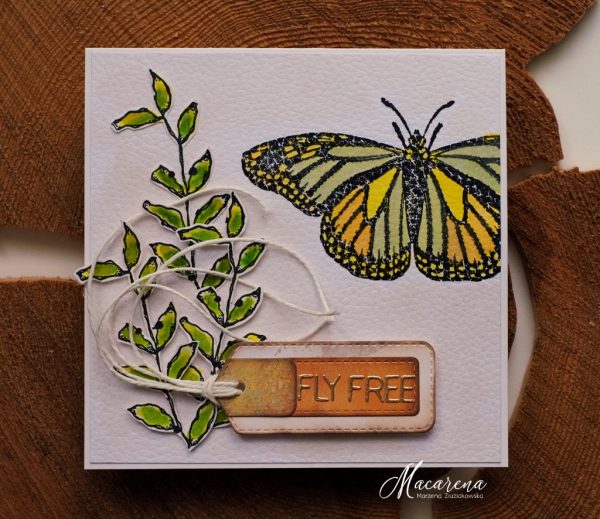 Macarena made a light and clear card using as a base Tim Holtz Distress Cracked Leather Cardstock and stamped tje giant butterfly from Tim Holtz Specimen set. She added dimension with fussy cut leaves of Paper Artsy Kate Crane Mini Stamp and a layered tag from Elizabeth Crafts Designs Tag Variety Pack dies.
