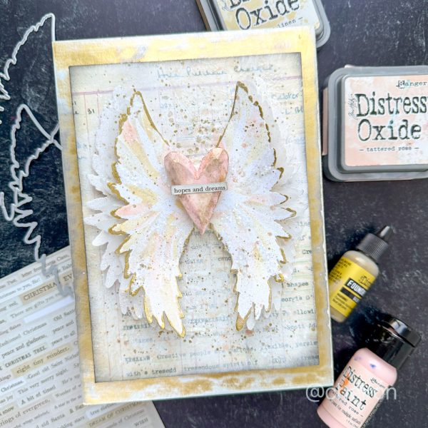 Cheiron created an Etcetera Panel using the Simon Says Stamp Angel Wings stencils and coordinating dies. She layered these onto a panel covered with Dina Wakley Typed Media Ledgers and gesso. She completed her project with a Tim Holtz Salvaged Heart.