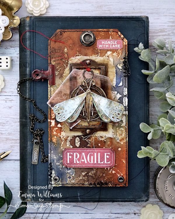 Emma created an Etcetera Tag and used the Sizzix Funky Insects Die Set by Tim Holtz as her focal point for “things with wings”. She layered the insect onto a combination of an idea-ology Optic Frame and Label Frame before adding stamped imagery from the Stampers Anonymous Mail Art stamp set.