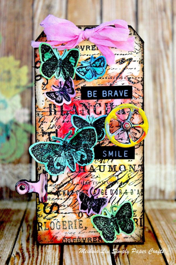 Meihsia was inspired to create a mixed media tag using Altenew Watercolor 36 Pan Set on the background, and decorated it with Tim Holtz Cling Rubber Stamps Papillon and Simon Says Stamp Papillon Wafer Dies.