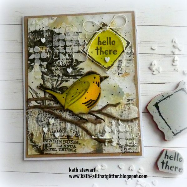 Kath created a card to celebrate the feathered friends who live in her garden and provide year round entertainment with their aerial acrobats around the bird feeders. She used Tim Holtz/Sizzix Feathered Friends Thinlits, Idea-ology Serendipity Collage Paper and Mummy Cloth, Simon Says Stamp Birdies Wafer Die and Tim Holtz/Stampers Anonymous Note Quotes for the sentiment.