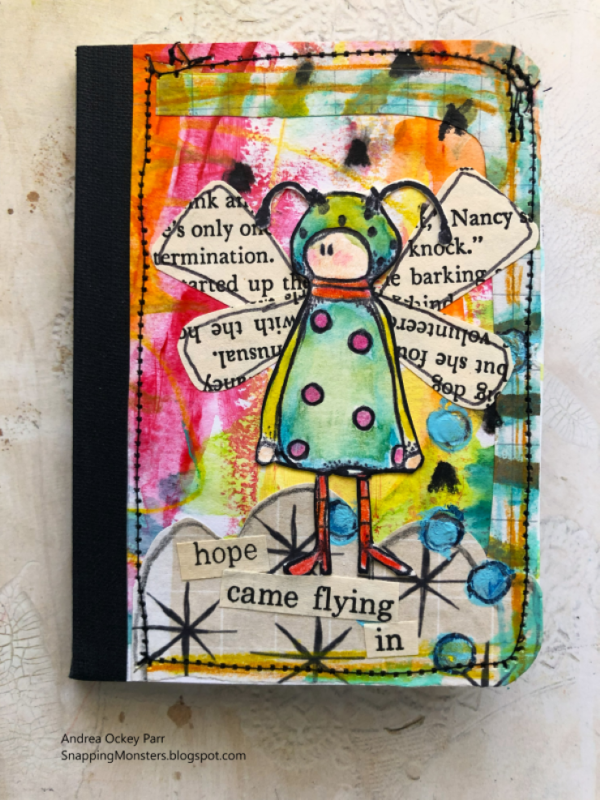 Andrea made a notebook cover using Kate Crane’s quirky girl image from her KCM017 stamp. She also used Kate Crane’s PS467 stencil and added lots of fun colors with a watercolor paint set and Distress Watercolor Pencils.