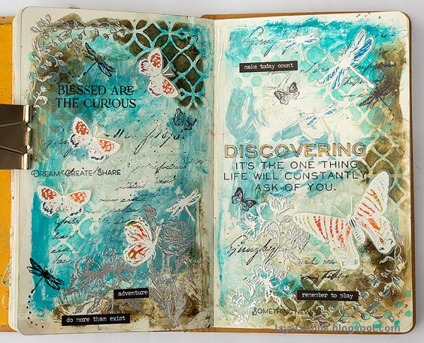 Anna-Karin made an art journal page with butterflies and dragonflies. The butterflies were stamped on vellum with Simon Says Stamp Beautiful and Curious and Big Botanicals stamp sets. The page was done in Ranger Dylusions Small Creative Journal.