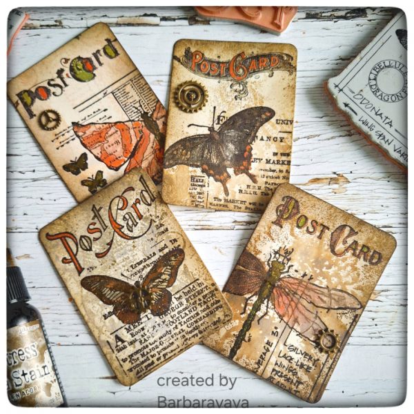 Barbara created a series of ATCs using various stamp sets from Tim Holtz Stampers Anonymous! For the background, she used the Weathered Textiles cms023 set. The butterflies are from the Botanic Collage cms447, Stamps Classics #1, and Stamps Classics #17 sets. For coloring, she chose Ranger Ink Distress Ink Pad and Distress Mica Stain.
