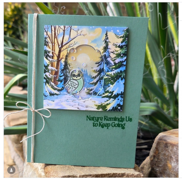 #50 Jaime Wheat – Anna-Karin says: Jaime made such a beautiful card using the Simon Says Stamp January Card Kit. Such a great idea to turn the focal area into a shaker and to tuck the little owl in between the layers. The string adds a great finishing touch.