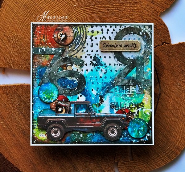 Macarena made a card with a lot of splatters made on the background using Tim Holtz Distress Mica Stains on the Paper Artsy Seth Apter Tissue pt06. For the wheels she used a jeep from the 49 and Market Rust and Revs collection.