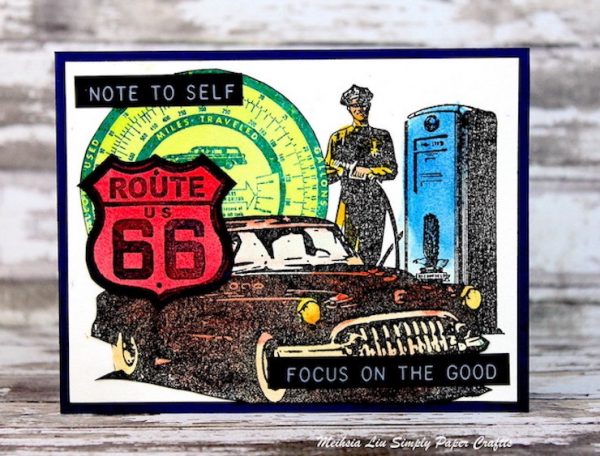 Meihsia was inspired to create a card using Tim Holtz Cling Rubber Stamps CMS128 ROAD TRIP on the background, and colored it with Zig Kuretake Gansai Tambi GEM COLORS Set of 6 and Tim Holtz idea-ology LABEL STICKERS THOUGHTS.