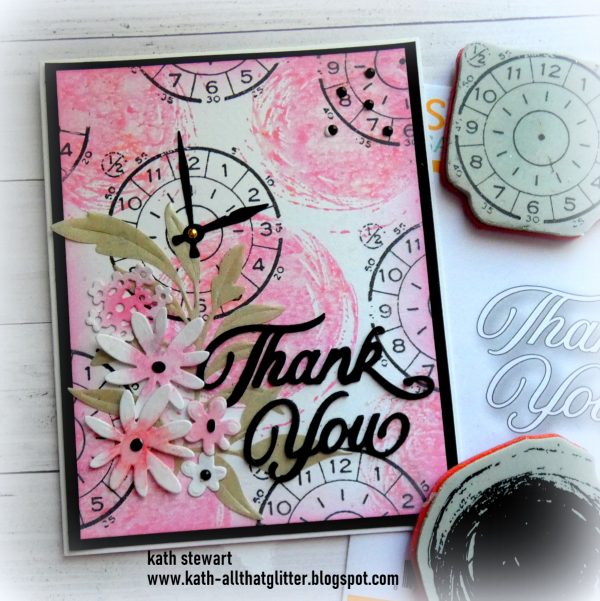 Kath used the images from Tim Holtz/Stampers Anonymous The Professor 2 and Brushstrokes to create a wheel themed background, Simon Says Stamp Windswept Leaves and Nuvelli Script Thank You Wafer Dies and decorated with flowers Tim Holtz/Sizzix Vault Funky Floral Wreath Thinlits.
