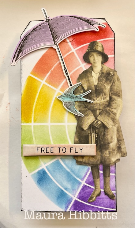 Maura was inspired by the movie “Mary Poppins” as she was working on her color wheel tag. She used Tim Holz’s Wheel Layering stencil on a Dina Wakley Media Tag, and blended Simon Says Stamp Inks from Apple to Amethyst.