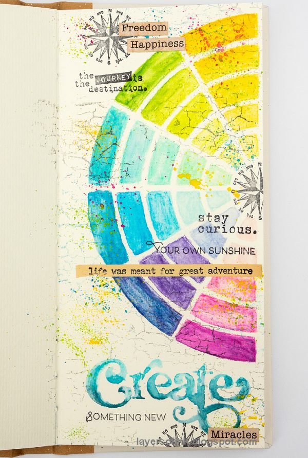 Anna-Karin made an art journal page this week and like Maura, she thought of color wheels. The color wheel was made with Tim Holtz Color Wheel Stencil and Distress Watercolor Pencils. It was paired up with stamps on the theme of travelling through creativity. Texture was added with the Simon Says Stamp Crackle Background.