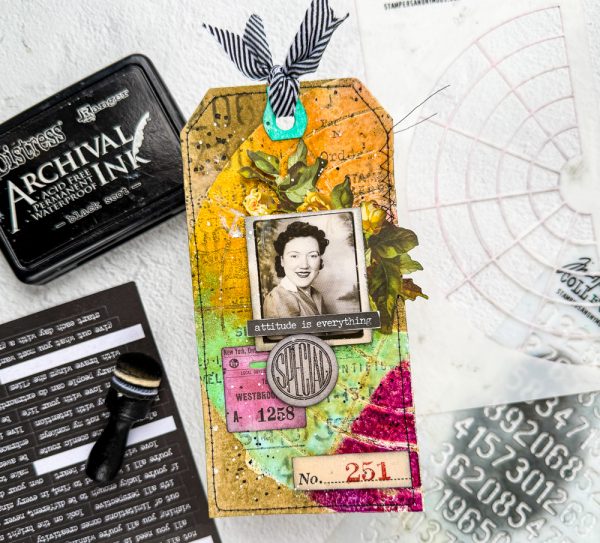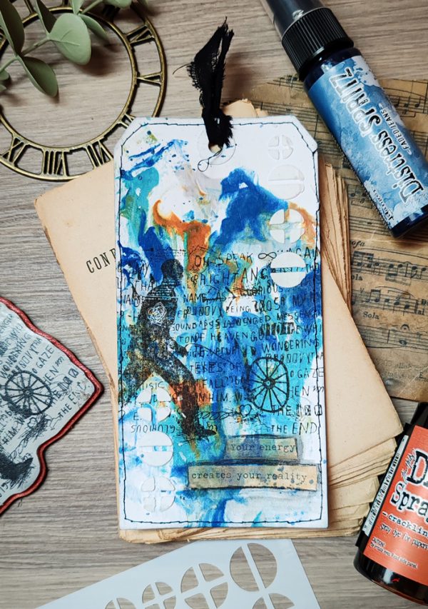 Zoey used Tim Holtz Cling Rubber Stamp Sideshow as the focus of her tag. She decorated it also with modeling paste throught a stencil and used Distress Sprays for the background and Distress Spritz for a touch of glimmer!